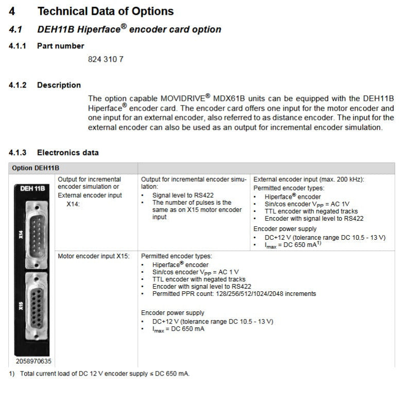 Der optional MOVIDRIVE® MDX61B Einheiten kann ausgestattet werden DEH11B mit Hiperface® - Encoderkarte . Encoderkarte eins Eingang bietet Die Motor zum Encoder Und eins Eingang eins extern für Encoder , andere unter dem Namen Fernentschlüsselung . Der externe Encoder Eingang als Ausgabe Auch verwendbar inkrementell Encoder zur Simulation .