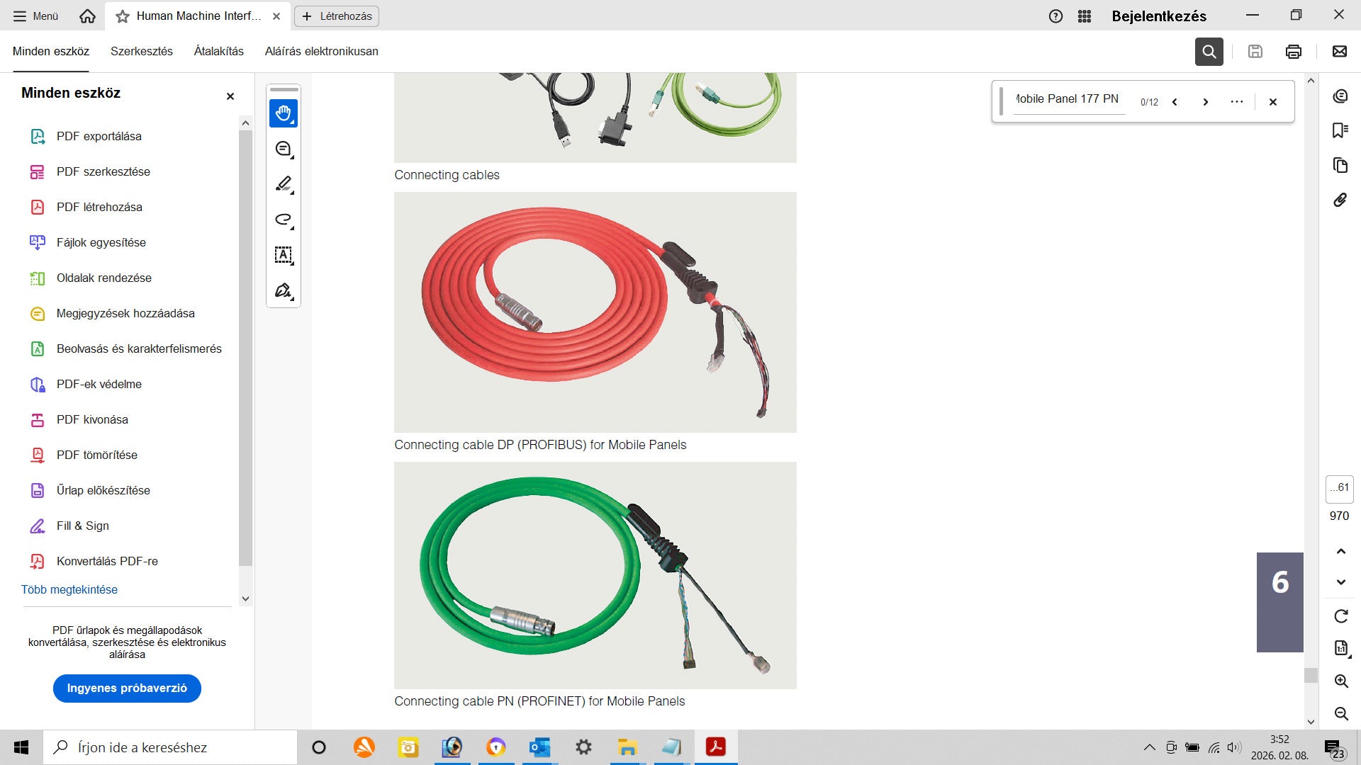 Hasznos információkat találsz a mobile panelekről és a velük kompatíbilis kábelekről az OEM, Siemens ST 80 catalog pdf-jében, különösen a 164. oldalon. A Mobile Panel DP-hez Profibus-kábel kell, a Mobile Panel PN-hez (például ehhez is) meg Profinet-es cikkszámú. Különböznek.