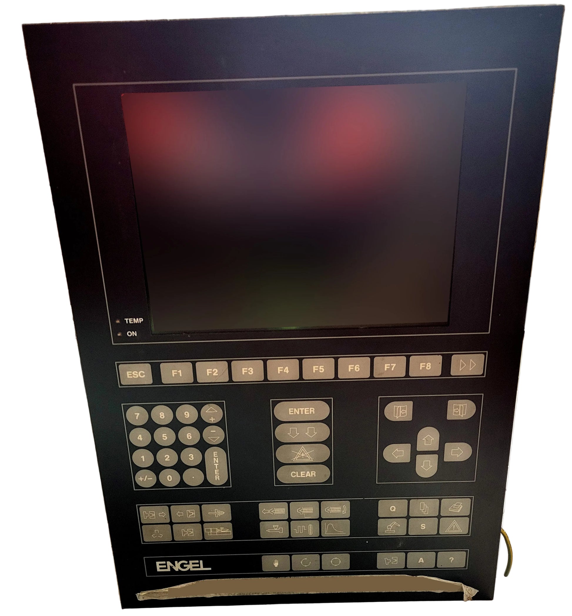 A képen látható eszköz egy Engel CC100 kezelőpanel, amit fröccsöntő gépek vezérlésére használnak. A berendezés egy integrált képernyővel és egy dedikált funkcióbillentyűzettel rendelkezik. Lehetővé teszi a gép hőmérsékletének (TEMP) és egyéb folyamatparamétereinek monitorozását és beállítását.